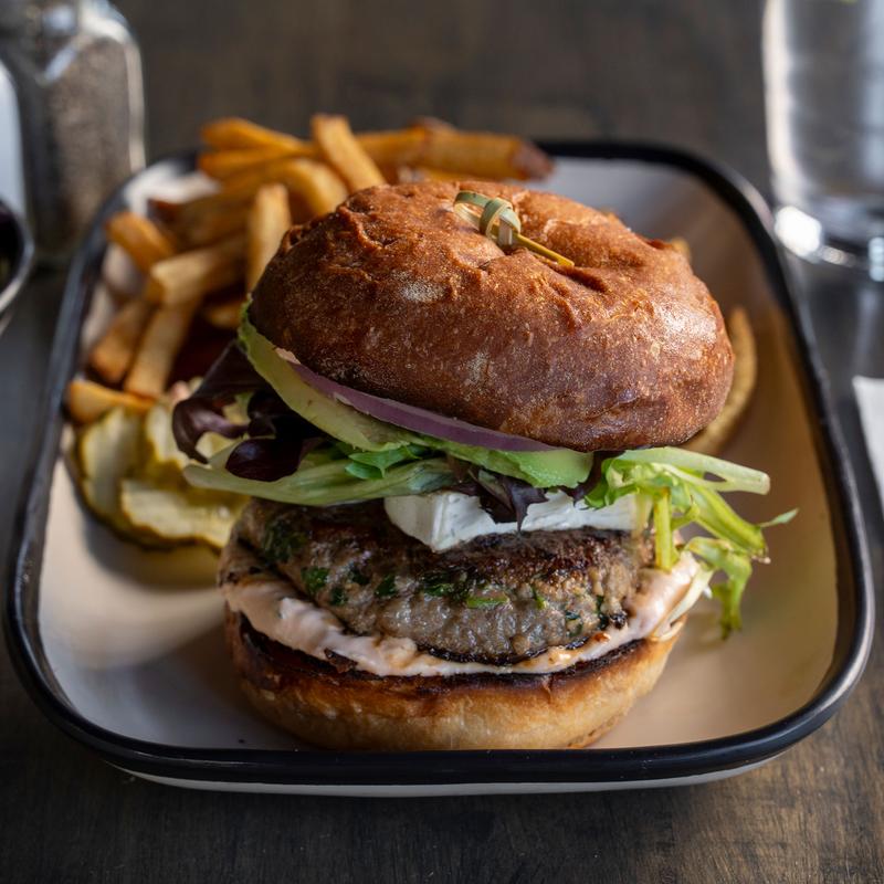 100% Lamb Patty topped with melted brie, avocado, mixed greens and a Greek sauce. on an toasted Grand Central Bakery Bun.