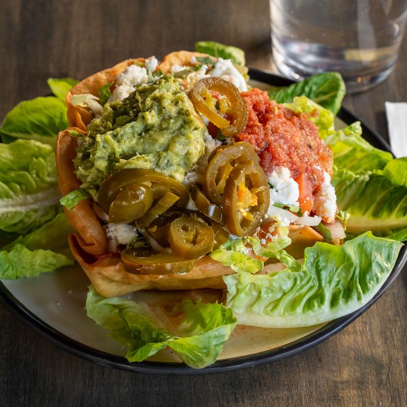 Your choice of seasoned ground beef , pollo or carnitas, romaine, beans, pico de gallo, sour cream, salsa guacamole, jalapenos, creme fresh