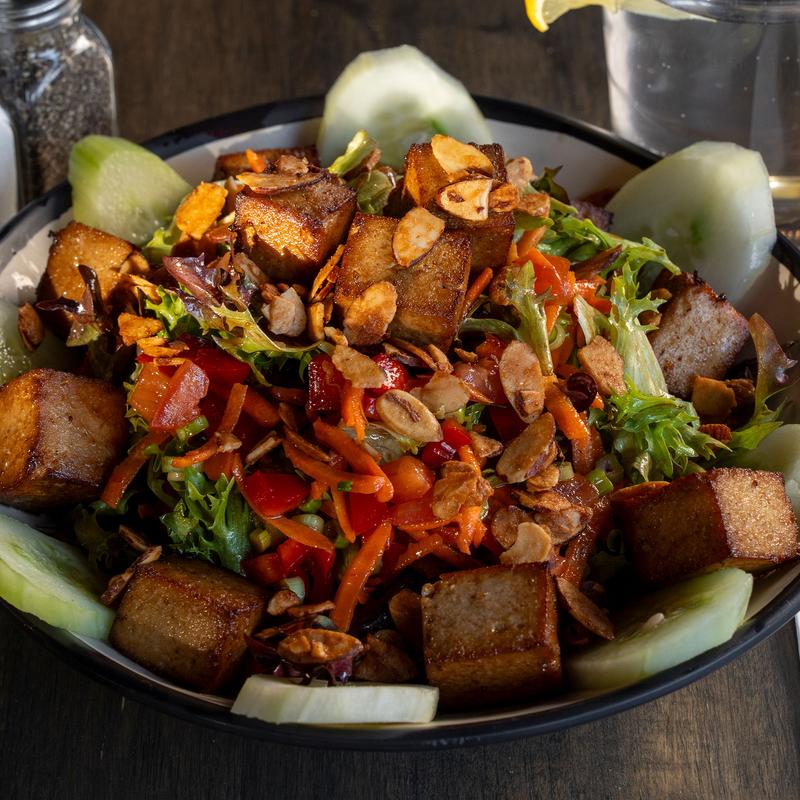 Tofu marinated with Sambal Olek and flash seared, spring mix blend with cucumbers, candied almonds, pickled carrots, daikon, and white balsamic sesame vinaigrette.