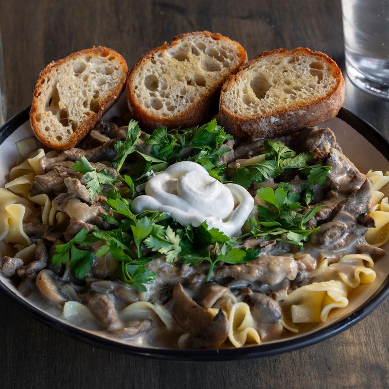 Tender sirloin strips with a creamy mushroom sauce served over egg noodles and a dollop of sour cream. Gluten free sauce. Gluten free spaghetti noodles available for $2