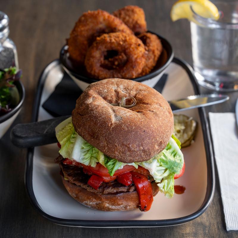 burger patty with habaneros, fried jalapenos and ghost pepper cheese served with red onion, lettuce, tomato and jalapeno mayo on a toasted Grand Central Bakery Bun.